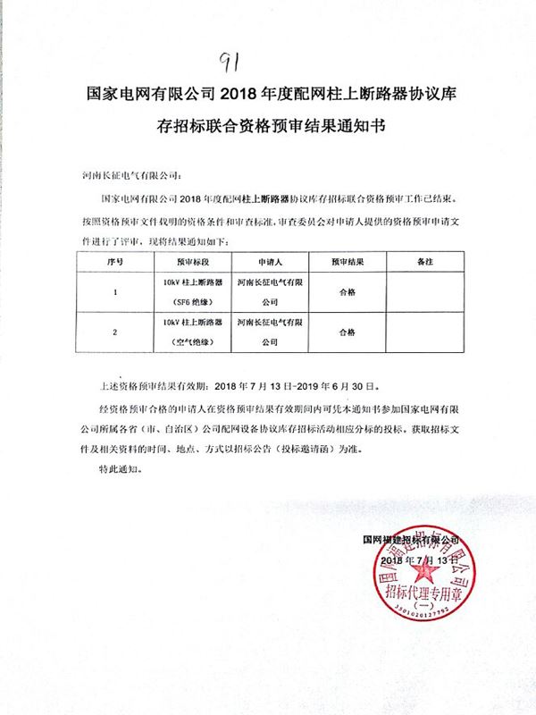 Our company successfully passed the supplier qualification verification of 10kV column circuit breaker organized by the State Grid Company in May 2018, and once again won the 2018 "Supplier Qualification Verification Certificate" (referred to as "a paper certificate"). Recently, the good news came again. In the subsequent joint pre-qualification of 29 provincial circuit breaker manufacturers organized by the State Grid Company entrusted by the State Grid Fujian Tendering Co., LTD., the company successfully passed again and obtained the pre-qualification notice.